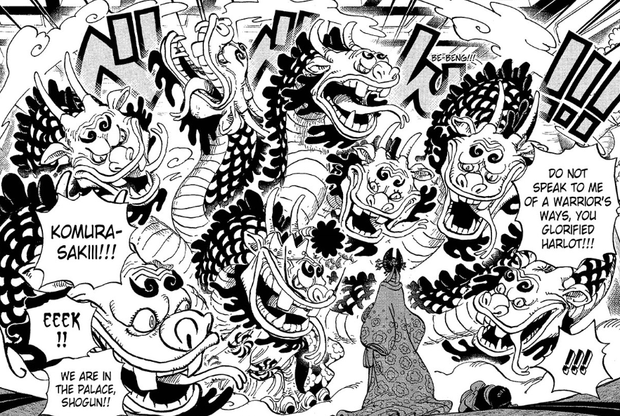 I’m a big fan of Orochi’s design. I can’t decide if it’s too ridiculous to be intimidating, or just ridiculous enough to intimidate; pretty classic Oda work. It would be too on the nose for his devil fruit to be an “Orochi Orochi Fruit” or an “Orochi Model” of something, so I’m gonna go out on a limb and say Dragon Dragon Fruit: Hydra Model. Which does raise the question of where the ninth head is meant to be…