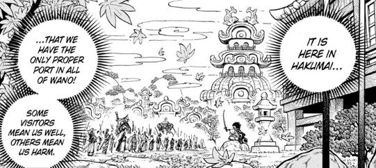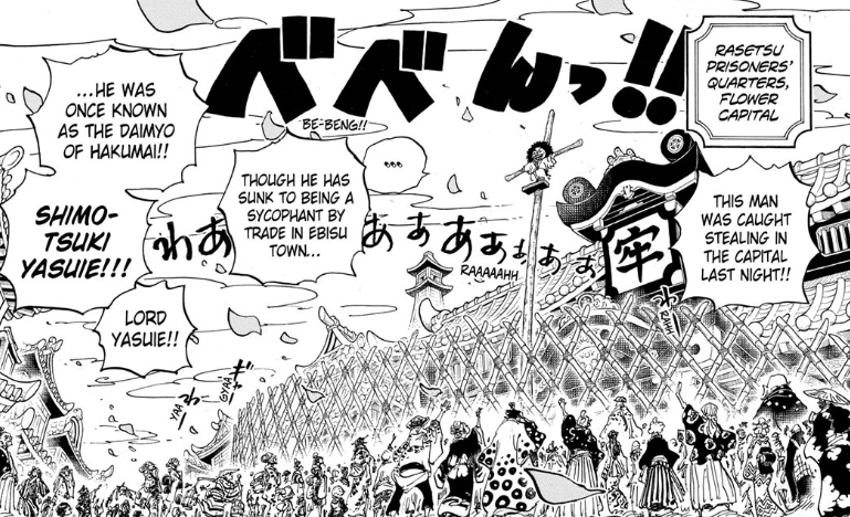 My favourite part of the Oden flashback at the start of the chapter is the backgrounds. Look at how lush and scenic Hakumai is compared to the wastelands we’ve seen so far in Wano. This was a beautiful place before Kaido and Orochi polluted it. Hopefully we get to see it restored to at least a little of its former glory before the crew moves on. In fact, the art was great all the way through the chapter. Those scenic shots of the view from the crucifix are amazing, and the crowd shots are spectacularly detailed. Once again the mix of a forced smile and genuine anguish on Toko’s face is brilliant, but the random Ebisu locals in the crowd don’t look quite as good.