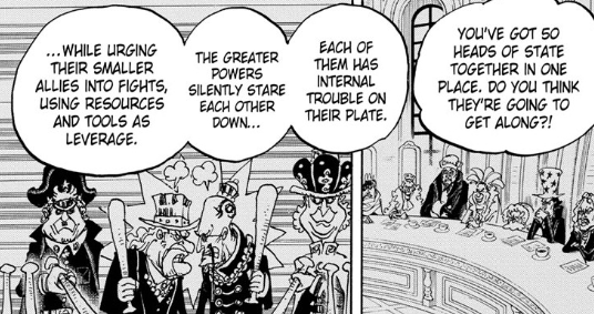 I feel like I was half right about how much Reverie we were going to see in this intermission. I expected another one like the last, with only tangential references to it, but instead we got a chapter that deals with it directly for the most part. But also aside from the big result of the Warlord vote, it was all so vague we learned basically nothing else. A fatality? An attempted murder? Something happening with Sabo, probably one or both of the latter? Something about Alabasta? Who knows what really happened.