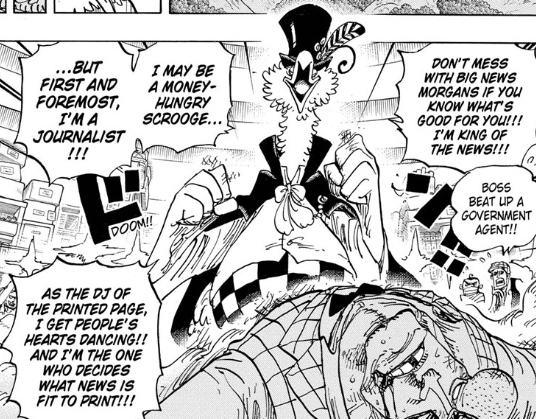 Never expected Morgans to be so much of a fighter. He’s coming to be kind of a wildcard in terms of how he uses his influence. Previous coverups and lies (like the Doflamingo one) in his paper, as well as running propaganda comics such as Sora show that he’s not one bit above taking the World Government’s money and printing their lies, but then he throws his support behind Luffy and rejects the cheque here because he thinks the truth is more interesting. It seems the news depends on Morgans’ idea of the most evocative story, true or not. Click Bait Morgans, they should call him.