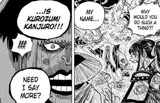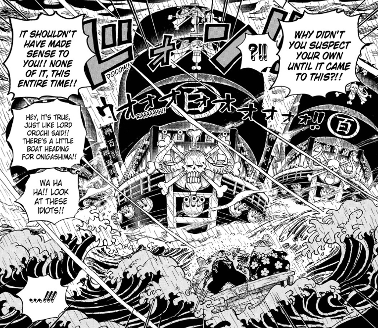 Then we address the traitor at long last! I saw a few people suggesting the traitor’s origin/motive would be a commitment to Wano’s closed borders, but very few suggesting the Kurozumi persecution as a background. It’s a good angle, I think. Giving the Kozuki Dynasty some blood on its hands is a nice change of pace from the totally idealised, squeaky-clean monarchies of other One Piece nations. A whole lot of fantasy falls into the trap of “monarchy good if you have the right monarch,” so deviations are always appreciated. While Orochi and Kanjuro are scum, the things they’ve been put through early in their lives are inexcusable.