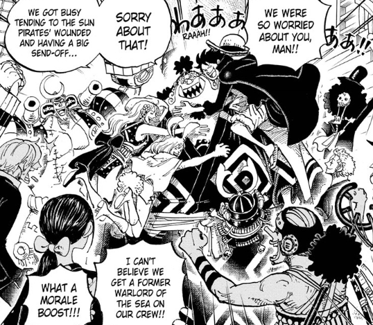 We’ve missed two whole chapter discussions and the most exciting new event is Jinbe’s return! The crew is (probably) complete and all together at last! I predicted back when the Arashi colour spread dropped that Jinbe would show up pretty soon after the flashback ended, because it was so obviously meant as a marketing thing that would need a longer shelf life than the standard colour spread, but I didn’t think he’d show up quite so soon… Or quite so easily.