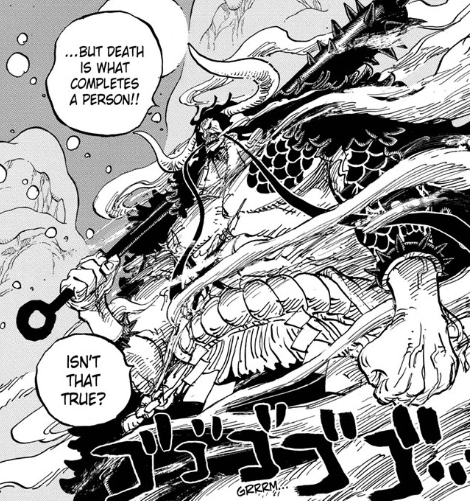 I’m glad Oda is taking the time to explore Kaido’s philosophy a little more. How many years of “why doesn’t he just jump into the sea” have we put up with? Although, I wonder how the jump from Balloon Terminal plays into this line of thinking. Sure, a jump from a sky island is an epic and novel way to go, but I wouldn’t compare it to the kind of noble warrior death Kaido seems to want here.