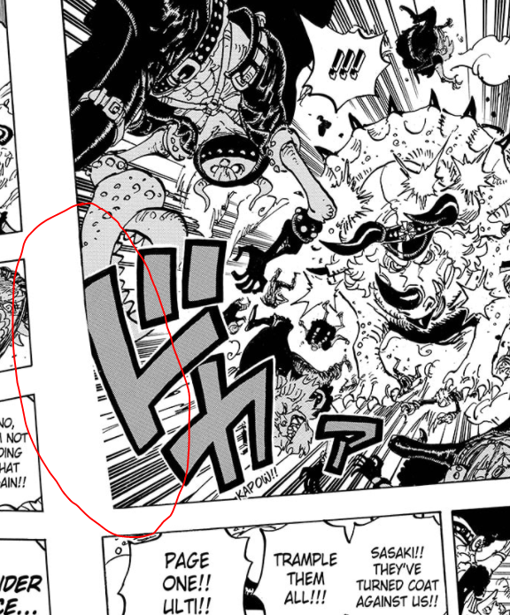Franky’s fight in this chapter didn’t quite work for me. Love seeing the crew fight, but compared to the spectacle and readability of the last few chapters, this is weak. Unlike the Kaido fight, which gives its huge main enemy space to breathe, the panelling here is incredibly cramped and doesn’t always scan well. We don’t see how Tama’s Gifters disengage the armoured squad from Franky’s legs, and as a result I’m not sure who it is that Sasaki charges through on the page 10-11 spread. His own guys? Tama’s ones, who she just kamikaze’d to save Franky? (oh wow maybe there’s more of an ethical image here than I thought) A mix of both as they fought? We almost need a visual clue to tell who’s been dumpling’d and who hasn’t.