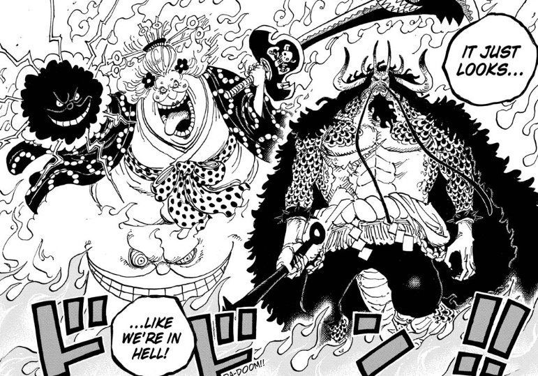 Kaido’s hybrid form is definitely a bit of a letdown. I don’t think that’s totally on the design of it – it’s the standard and expected arms, legs, tail and cowling model used for most hybrids already – but the presentation. Look at him; he’s just kinda standing there awkwardly. I can understand flat posing on regular Kaido, with his brick shithouse body and tree trunk arms. That version can only be so flexible before it starts to get uncanny. But the hybrid model is thinner in the limbs, giving them a greater range of movement. It would have been so much easier to draw him coiled to strike, or brandishing his weapon, or visibly reveling in the thrill of battle, but Oda’s just left him with the most neutral body language possible. Maybe it wouldn’t stand out so much if he wasn’t right next to Big Mom, who’s looking a hell of a lot more like you expect a One Piece villain to. Her manic energy and raised weapons are a stark point of contrast to the dull lizard man. The anime doesn’t have to touch her for you to see the flames dancing in her hair and the lighting strobing around her fist. It’s all drawn so energetically that your mind fills that stuff in on its own. Now that’s a villain with some character!