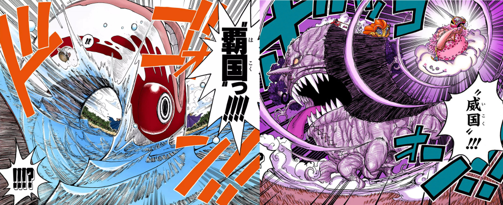 It’s also hard to tell what kind of attack is actually being used. Is it a flying slash-style air pressure shockwave? Haki? A miscellaneous energy thing, generated in the same way Luffy and others make fire with no better explanation? The similar attack used by Dorry and Broggy on Little Garden seemed like just air, but Big Mom’s version on Tottoland got an interesting purple filter in the colour manga. Unlike the anime, the colour manga doesn’t usually add that kind of flourish on its own, so I consider it worth taking note of. Oda uses the kind of screentones he would for a bright light in this chapter, even though he didn’t in Big Mom’s Tottoland version.