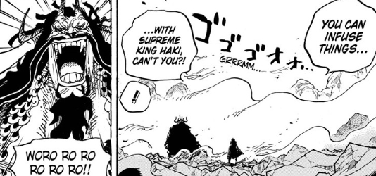 I think they way the powerup is portrayed muddies the water a lot with Luffy’s last powerup – the haki projection and injection he learned from Hyogoro. We know Luffy picked that up because we saw him destroy the collars, blow up the tree before the raid and do substantial harm to Kaido with his regular attacks, but the dialogue here feels like the move only truly clicks when you add offensive CoC to the mix as well. Even though we know they’re two different things, Oda hasn’t made it distinct enough where CoA ends and CoC begins, or if Luffy’s using just CoC instead of both at once, or any other way it might be, which makes the initial advanced armament powerup feel a little cheaper. And it feels like the highest level techniques are only for the one in a million with the special haki (plus training to be one of the “handful of the very strongest” on top of that). We’ve yet to see anyone without CoC do the clash-without-touching thing.