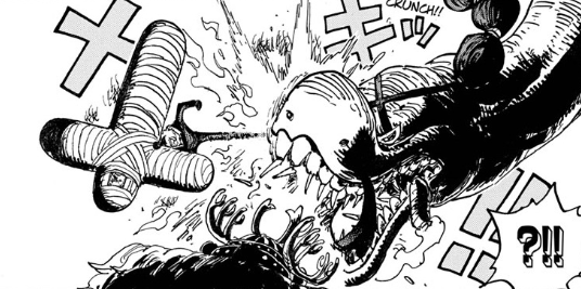 While Sanji’s entrance was great, I don’t think his move and its effects were super well communicated. Queen’s neck spinning around to block the arrows makes sense. But I don’t how he managed to go from that to swinging low enough to take out Perspero (without cleaning up any of the samurai surrounding him) and end up with his whole body flipping over the air. It feels like there’s a panel missing that should show Sanji redirecting the dinosaur into the candyman. This could have been a bigger moment if it read more clearly.
