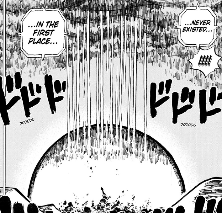Seeing a whole island destroyed in an instant is pretty shocking, and marks a genuine escalation of One Piece’s power scale. Where the likes of Dragon Ball went fast enough to have planet busters by volume 30, One Piece has done remarkably well sticking with the ceiling it set with Mihawk’s introduction in basically year one. Abilities that could potentially destroy an island, not just depopulate its surface, have been few and far between, and have always seemed like it would still take the user significant time and effort to actually sink a whole landmass. It was, of course, inevitable that things would reach this point by the endgame, but it’s still something else to see it actually happening.