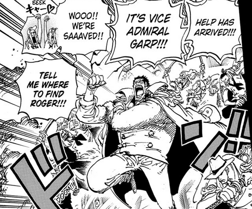 At a guess though, I think he doesn’t know the full story, and will find out about the slave hunt only after arriving. Remember that Sengoku’s recollection of Garp and Roger’s teamup at God Valley was to “protect Celestial Dragons and their slaves,” which is an interesting choice of words to say the least. Why make a point at all of protecting slaves that were already (literally) branded for death? Perhaps the truth is that both were protected, but the Celestial Dragons were protected from Rocks, and the slaves were protected from the Celestial Dragons. I’m sure he could find a way to play off giving the slaves a chance to run as “just protecting your property from getting cut down by Rocks, go after then when it’s over” and pretending he didn’t know better. Remember in chapter 957 that right before talking about the teamup at God Valley Sengoku is reflecting on how much Garp’s personal moral compass disagrees with the Celestial Dragons and how close he’s come to being eliminated for insubordination. I think we’re edging closer to the full picture here, and I hope that’s not just my enjoyment of Garp’s character talking.