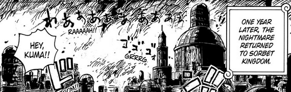 With all that heavy stuff out of the way, let’s enjoy some worldbuilding and fun details. Did you notice in the montage toward the end of the chapter that Kuma actually got that iron cage crib built? Cute, but you have to wonder the impact of sleeping behind bars on a baby’s development. How about the crucifix on the church wall? It’s got split ends like the cross seen on Oars’ loincloth and carved on the walls of the secret straw hat room, and where the arms meet is a symbol not unlike Alabasta’s flag and the Kozuki Family crest. Could Kuma’s religion be more than just a stock standard Christianity stand-in?