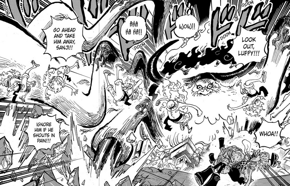 But where did Borsalino go after the last chapter’s standoff. Has there been a little offscreen clash with Luffy and Sanji he’s just retreated from? Was he forced to get out of the way as demon Saturn stampeded in? I’d rather have seen either of those things than releared what Caribou knows at the start of the chapter. It’s not a hard one to explain, but it still feels like a continuity glitch, which is frustrating. It came up during the ‘who fed Luffy’ discussions in the past week that Luffy’s position changes before and after the flashback, last seen in Franky’s hands going in, then lying a decent way away from the group with no apparent action taken by him or Franky after. If there was one thing you could absolutely say in the Onigashima battle’s favour, it’s that it was intricately and carefully mapped. We had the layout of the whole castle and knew where everyone was inside it. No one teleported from one side to another in a single page, they got at least a little bit of offscreen time to travel before popping up somewhere new. The attention to detail was a highlight there, which makes it all the more disappointing that this battle’s staging misses beats like this.