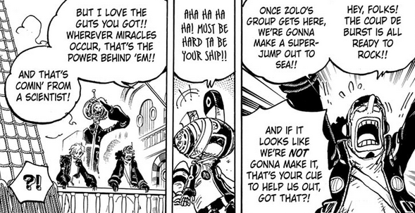 It’s a good moment for Usopp rallying the crew here, both to follow the plan and to improvise if it doesn’t work. Confident leadership from a once self-proclaimed captain. Good for him.