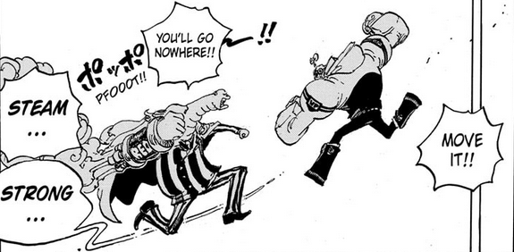Stussy and Kaku’s dialogue in the following scene seems at odds with Lucci’s immediate recognition of and deference to Mars in his bird form a few chapters ago. Maybe he’s better at recognising voices than the two of them are, or he may simply hold a higher rank and have gotten more hints about the true nature of his bosses than the other two. I’m sad for Stussy’s sacrifice, in part because this arc hasn’t at all made the most of her as a character. Her betrayal of Cipher Pol was a compelling early twist, but then she lost her stylish and memorable original outft for the same leotard look every other woman in this arc got, dropped off the map through the middle of the story, just to get finger gunned and now make the ultimate sacrifice. This is a character who’s been lurking on the sidelines of the plot for seven years. That’s getting close to the point where there, at least in Japanese, the series might have readers younger than she is as a character. A minor character, sure, but I hope this isn’t truly the end for her. Oda can offer far better.