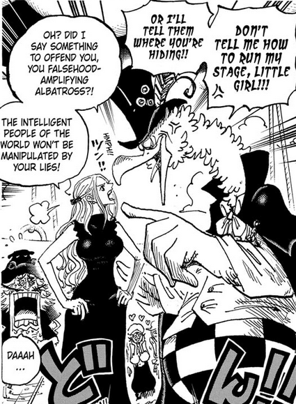 The Vivi and Morgans dynamic has proved unexpectedly fun since they got paired up, although I don’t think Wapol contributes quite as much to it. Morgans is still such an enjoyable character on the whole, chasing only the money, whether that means defying the Government to tell the truth, or defying the truth to put a dramatic spin. His attitude toward the world sinking is the ultimate show of how it’s all about him. Big fan of Vivi’s ‘don’t expect to live through it anyway’ attitude here. That’s a girl with nothing left to lose. It makes me very excited to see what her role is going to be in the upcoming arcs and the series’ finale.