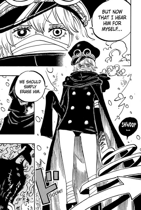 This conversation is followed by the full Gunko design reveal, and… Ugh, I feel like we’re so close on this one. I like the hat and jacket and mismatched eyes. I think the pantsless look can work in this seafaring world where swimsuit bottoms are reasonable everyday attire. But they just don’t go together. It really just looks like she forgot to finish getting dressed in the morning. And the fabric power as well; if Oda wants to get a bit fanservicey by making her unravel her clothes to attack he can do that – the world of shonen has far worse – but you have to start with the clothes first. That untwisting sleeve is a glimpse of what could have been if she’d come decked out in layers of baggy clothes to gradually weaponise, revealing more leg or chest or whatever else bit by bit as the arc goes on.