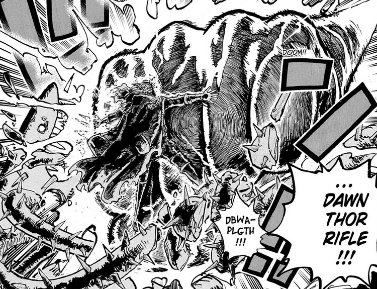 Luffy taking out Sommers is given a multiple spread treatment to really sell the idea that this is it. The spiral rendering for the haki coating does a great job of conveying the spinning aspect of the rifle move, and just gives a lot of visual interest to the page. What are the mechanics of the Thor moves though? Here, Luffy has to grab a lightning bolt. On Dressrosa, it seemed to be electric all of its own accord. Back then, I’d assumed this represented Conqueror’s Haki. We’d just been introduced to the idea of lightning coming out of a clash of conqueror’s, and during that first instance with Chinjao, Oda obviously hadn’t finalised the look of the effect because it comes out with normal lightning instead of the black stuff. Ugh, I’m overthinking it. Probably better to just roll with the punches for these kinds of things.