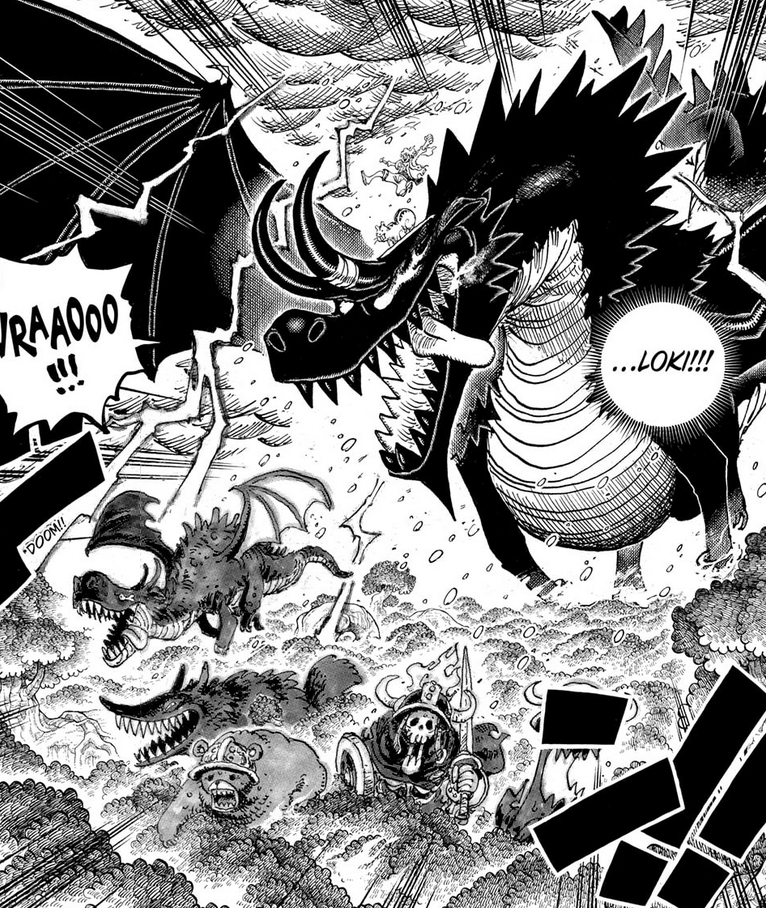 Getting a better look at dragon-Loki now, and yeah, still awesome. The rendering in this chapter makes it more clear he has a few layers of manes around the back of his head, neck and shoulders. It would be very Oda to give some of these the pink of his hair or the purple of his cape to offset the black body. You know how these things tend to go. Anyway, I love the sleeptids freaking out in the reveal panel here, great detail.