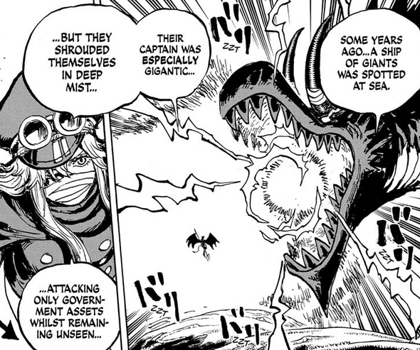 Imu seems to confirm that Loki only targeted the World Government on his rampage, which definitely raises the question of why Shanks had to shut it down. Before we might have assumed that Loki was taking things too far and hurting innocents as well, but now that we know him better and have this confirmation, it’s clear that there’s more to the story. It also makes for an ironic parallel to how Imu used Harald as his knight, an Ancient Giant that emerges from the fog. It must have stung Imu’s pride to see his own monster used against him like that.