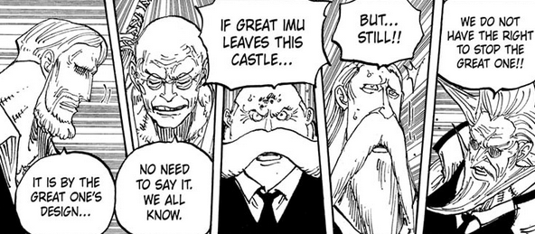 Despite revolving around one moment, there’s actually a lot of smaller details in the chapter that are worthy of picking at and analysing. I really liked the scenes of the Five Elders at the start. You can see how Garling is something of a disruptor to the older four who have served together for decades or more. They’ve met up without him. He presses for more action when they would remain complacent. He’s the first to defer to Imu’s higher authority and call the debate settled. He reads as the new manager trying to make an impression and establish his style next to the dig-in leadership team.