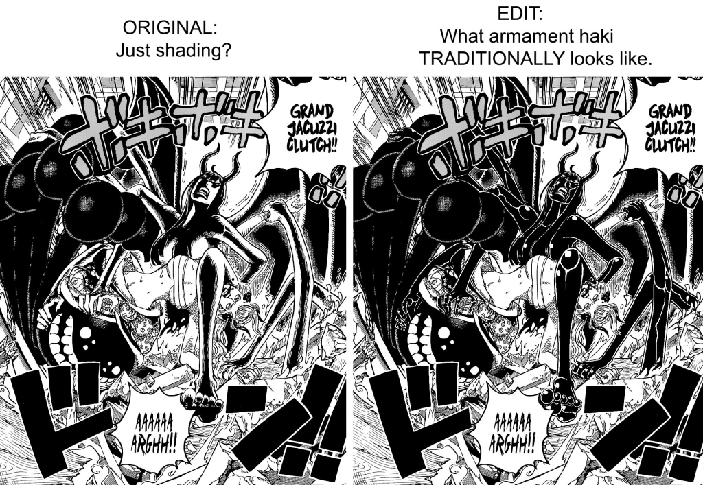 I was going to screencap a couple of panels to compare how haki is drawn, but someone on reddit made this edit, showing the point better than I could have hoped to: