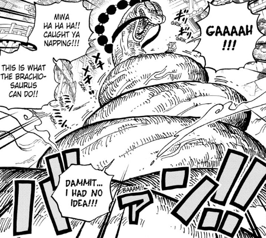 I’m amazed that Oda was able to top the Triceracopter so soon, but Brachiosnakeus sure has done it. There are just no words for Oda’s insane creativity. Every part of that sequence was hilarious.