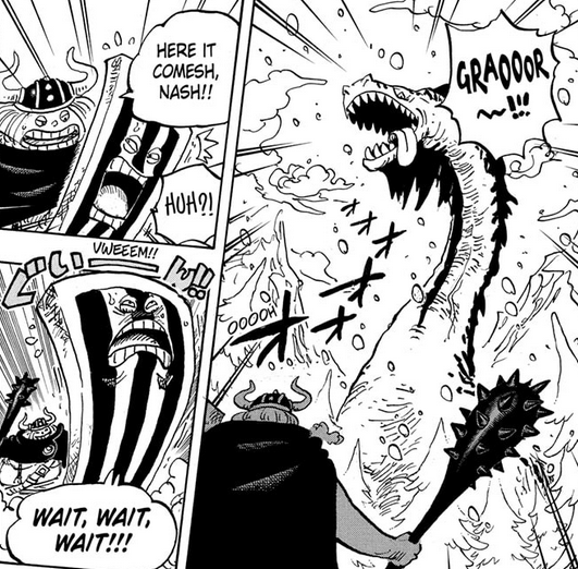 And there’s some lore here with Goldberg’s homie shield, Nash. This thing was first shown off in chapter 899, just as Whole Cake Island was wrapping up, in Hadjrudin’s segment of the Grand Fleet cover story, which was perhaps suspiciously just a series of character intros rather than a mini story like the rest. How far in advance has this been planned? I’m definitely curious to hear any details about a fight between the giants and Big Mom after she left Elbaph and acquired her powers. Does it have to do with the marriage arrangement with Loki that fell through, or did some giants at some point come to settle things over her childhood rampage? Feel like I’m forgetting whether or not this was hinted at anywhere else. It’d be cool for it to end up being plot relevant, but my gut is saying SBS summary.