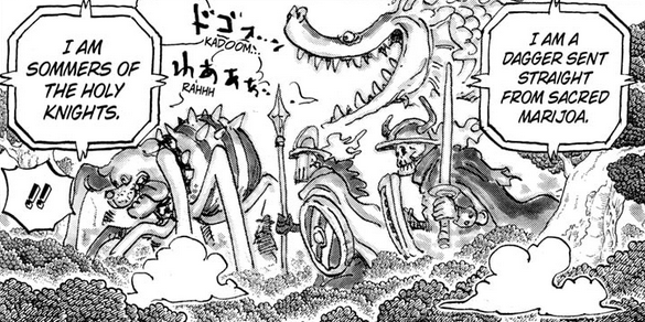 The Holy Knights are moving around pretty quickly between chapters here, Gunko going from her position with Sommers and the captive Strawhats all the way to the kids’ location. Sommers also seems to be leaving in that direction in his first scene, but she’s outpaced him to a pretty ridiculous degree.