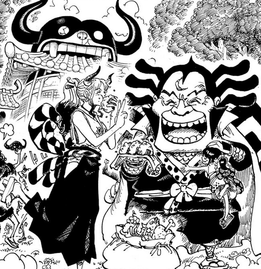 Dorry and Brogy finally arrive and Oda takes the time to show Imu/Gunko being a physical match for them rather than completely relying on the mindwipe hack. Do we think it’s weird though, that Imu summons both a relatively normal shortsword and a shotgun that’s way too big for a human but still too small for a giant? Maybe they have limited control over exactly which weapons they can draw. Or maybe the size is designed to suit their real body. Well anyway, the shot to the arm is a much more abrupt and extreme injury than I usually expect from One Piece, even if there’s a good chance the contract lets him regenerate it.