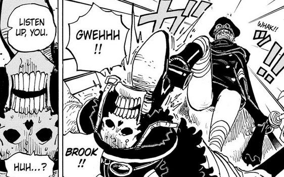 Well, it gives us a chance to see Brook and Gunko interact. I’m very curious about Book’s like that there’s ‘something about that woman.’ The scans interpreted this very directly as him recognising her from somewhere, while the official translation keeps it vague. I’d love for someone with the raws and some Japanese skill to clarify it. Leaping off from the recognition angle, did she come to one of his concerts during the timeskip? Or maybe (extreme longshot) we’re going to go into discussions about immortality over her having been around since before Brook’s death. Probably not, given that Garling has visibly aged during his Holy Knight tenure, but catching up with an unchanged immortal would be a really fun way to use Brook’s powers. I loved seeing Brook declare his loyalty to Luffy here. Funnily, Gunko clutches her chest after the first time she kicks him – is it hurting her heart to attack her favourite singer? Not that it stops her from laying into him in the following panel, so maybe I’m overthinking it. And what I’m glad to see about this scene as a whole is not a single mention of panties. So many people speculated about Gunko and Brook’s meeting and how he’d react to her pantsless state or if he’d be the origin of that fashion choice. But honestly, from discussions of the female Egghead outfits to here, I think ‘panties’ is a word the fanbase uses a little too liberally for any kind of minimalist bottomwear. Despite the visual similarities, a bikini bottom or the lower half of a leotard or one piece swimsuit aren’t the same thing and don’t carry the same connotations as actual underwear. That’s meant to be the whole thing with the Japanese panty obsession, right? Seeing something private that would be taboo to reveal publicly. Something designed as outerwear, even with the same amount of skin showing, isn’t going to give a perv like Brook the same voyeuristic thrill. Like don’t get me wrong, Gunko’s outfit is still ridiculous, and so were some of the Egghead design choices, but it feels like an exaggeration calling every frame of them ‘panty shots,’ you know? Anyway thank you Oda from not taking the low-hanging fruit, please don’t immediately prove me wrong next chapter.