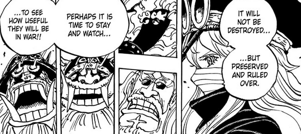 I think back to Dressrosa and Doflamingo, and how his big thing as a villain was being a puppetmaster, able to sow chaos by influencing or directly controlling the various parties he’d wronged so they clashed with each other. How he made Luffy fight Bellamy when he didn’t want to, forcing him to hurt his friends. Even just the way he preferred to rule the kingdom, be served by the people and look down from above when he obviously had the power to level the island in an afternoon when he wanted to. Given his knowledge of Marie Geoise secrets, you have to wonder if Doflamingo’s intent was to make himself into a mini-Imu all along, and the whole arc was foreshadowing and stage-setting for this ultimate battle.