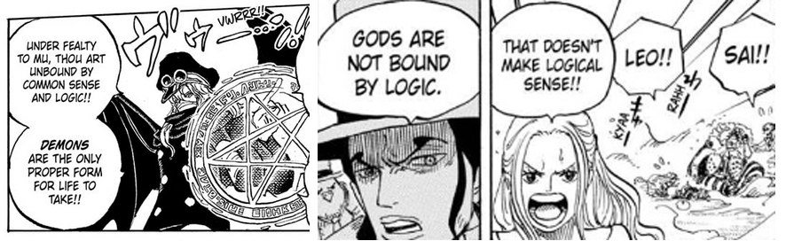 The dialogue surrounding this is crazy too. Not being bound by logic or common sense under Mu’s control sure sounds a lot like what Lucci said to Vivi about the Celestial Dragons in chapter 907, that “gods are not bound by logic.” What does Lucci know? And how far do I read into this idea that demons are the “proper form for life to take,” like some kind of demonic carcinisation. Does it suggest Imu is a natural born demon/devil with a superiority complex?