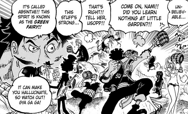 And what an opening to an arc. The crew gets smashed on hallucinogenic booze and loses a day or two and end up separated, left to piece together what they missed. It’s fairly unique. You might compare it to Zou, where the reader’s POV starts at the end of a normal arc and we get the main events filled in via flashback. But after Egghead’s cutaway, there’s precedent for not circling back to the skipped day as well. It’s going to take a lot more than one chapter – and probably the next one – to be fully sure what Oda’s building up to here and how he plans to structure it.
