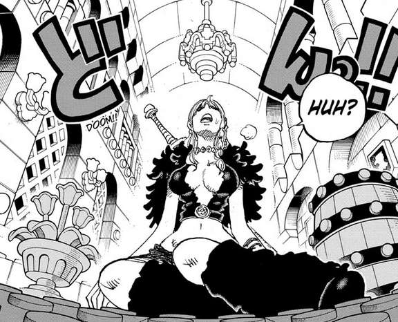 On the flip side, holes open up in the sense of space and framing of Egghead’s set pieces, inclusive of cutaways. When talking about Wano, I’ve lauded praise on Onigashima as a setting, for the complexity of its layout and the thoroughness of its mapping. But despite the sheer amount of things to keep track of, it never felt like anyone teleported across the island, or showed up next to the wrong landmark or experienced any kind of contradiction in their placement on the stage. Oda obviously cared a lot about making it feel like a functional locale. For Egghead, not so much. How is Future City laid out? Doesn’t matter. The only thing really important is the cloud machine in the middle. The buildings are clustered close when Luffy needs something to bounce between and scattered far when the Elders need space to be summoned in. Why is Luffy in Franky’s hand before Bonney’s flashback and lying on the ground far behind him after? Did he land next to the food machine or not? Shouldn’t Nusjuro’s leap up to the Labophase have landed him next to the Sunny, instead of far enough away that Zoro and Jinbei have room to chase him? Even outside of the main story, the pre-arc global events have Blackbeard fighting outside the Amazon Lily sanctum in one panel and black holing the buildings inside the next. Sabo’s Marie Geoise flashback frames it as if he has time to meet Bonney, escort her outside, then make it back into the Empty Throne’s room in the span of Cobra’s meeting with the Elders.