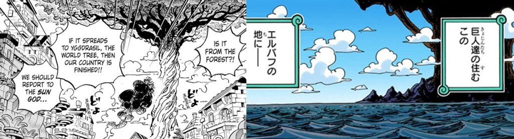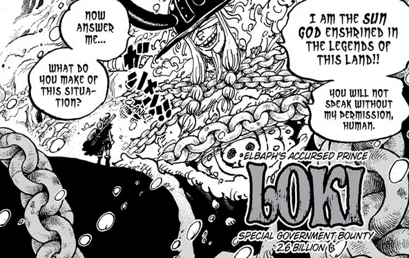 To fixate on one little part of his appearance, what’s with the blindfold? And the rendering in the last panel revealing the shape of his eye? I would put down a reasonable bet that the devil fruit he stole gives a power somehow related to or activated via the eyes. On the other hand, the loss of an eye is a very Norse mythology thing to include. The missing rendering gives the feeling of an empty socket, and we are still due an important character with an eyepatch. Or it could just be intended to imply Loki is using Observation Haki or some some other advanced sense to “look” at Luffy through his blindfold. I can never be sure how far to overthink these kinds of small details.