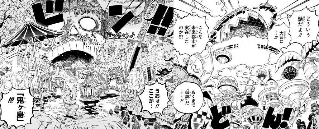 I’m looking forward to where this Lego-look castle is going to go next week. We’ve seen Oda toy with this idea for a colour spread many years ago (chapter 622) and it looked pretty good back then. Makes yuo wonder how long he’s wanted to do this. I have no particularly novel theories about what’s going on here – the same likely conclusions everyone else seems to be reaching – she’s probably on Elbaf already, a plaything to some kind of child prince. Maybe Loki, but I don’t know if the timing lines up him to act that young. The real question is how this happened while the rest of the crew remains at sea. Did an envoy sail on to meet them? Could the Great Erik have reached Elbaf then departed again for some reason?