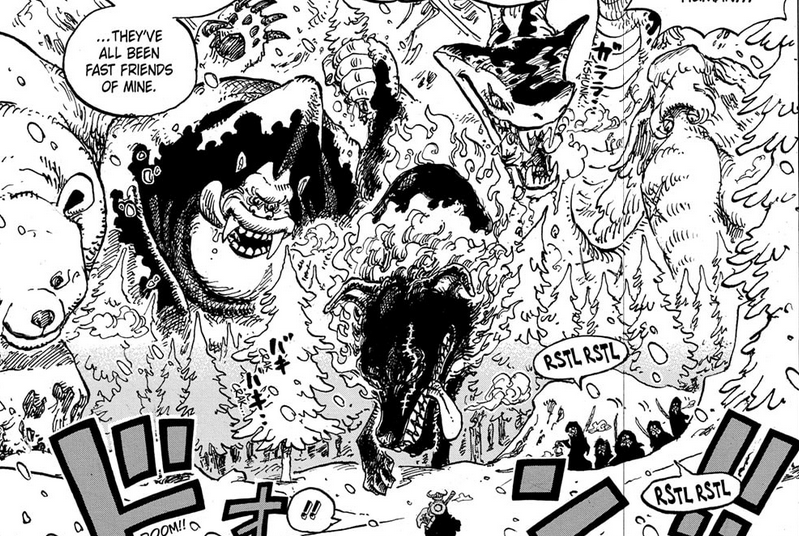 It’s been noted that the animals guarding the mountains are almost all species originally designed for the Strong World movie. But whether this is mean to hint at a connection or just be an Easter egg is anyone’s guess. The outlier seems to be the wolf that shows up with the koma-animal flaming mane and tail commonly seen on Wano. Were the two nations connected in some way far in the past for crossbreeding to occur? Whatever the case, I really enjoyed Luffy instantly taming them.